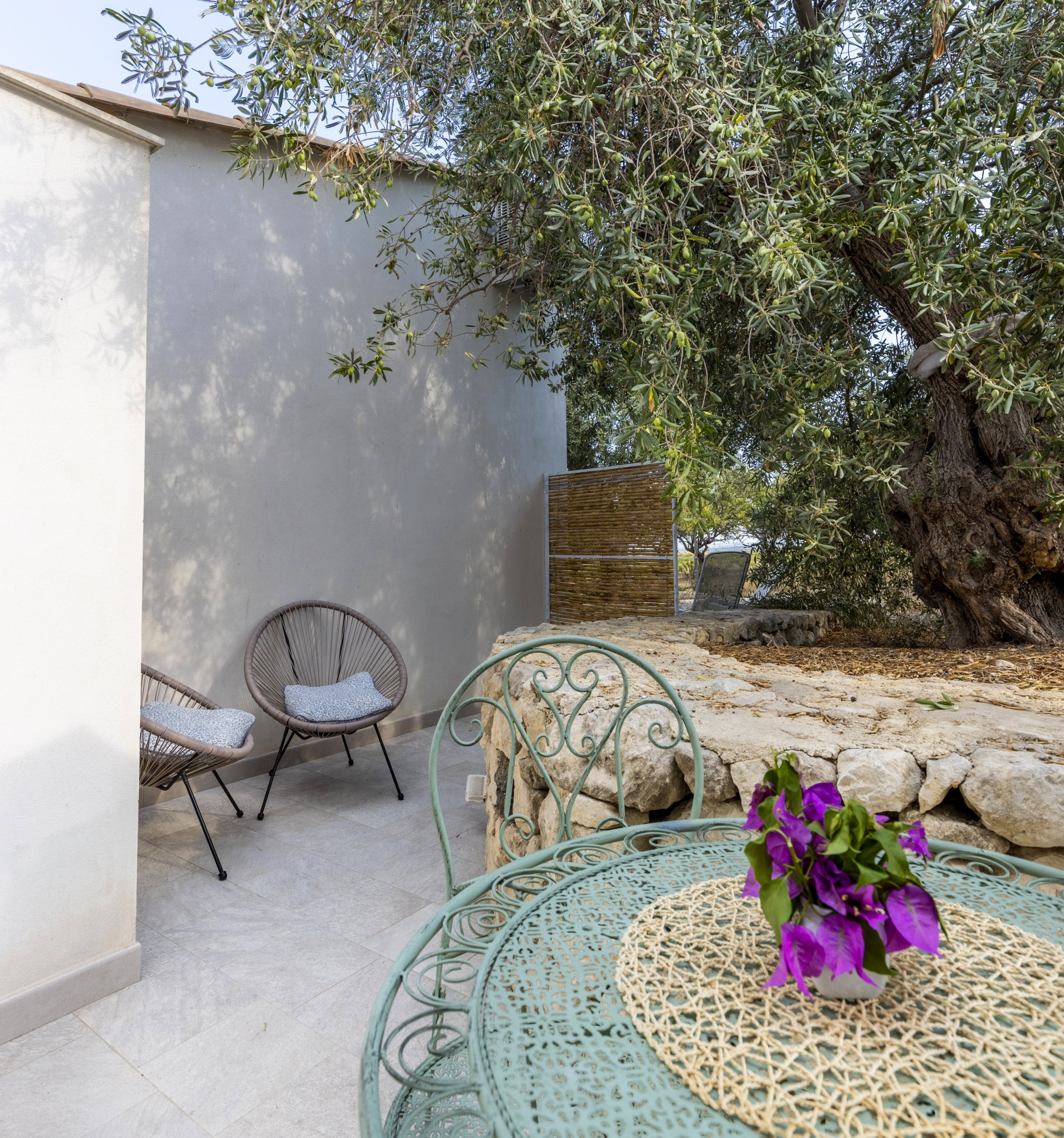 The patio is equipped with a pergola, a table with chairs, two armchairs, and a drying rack. The shared terrace includes various seating areas.